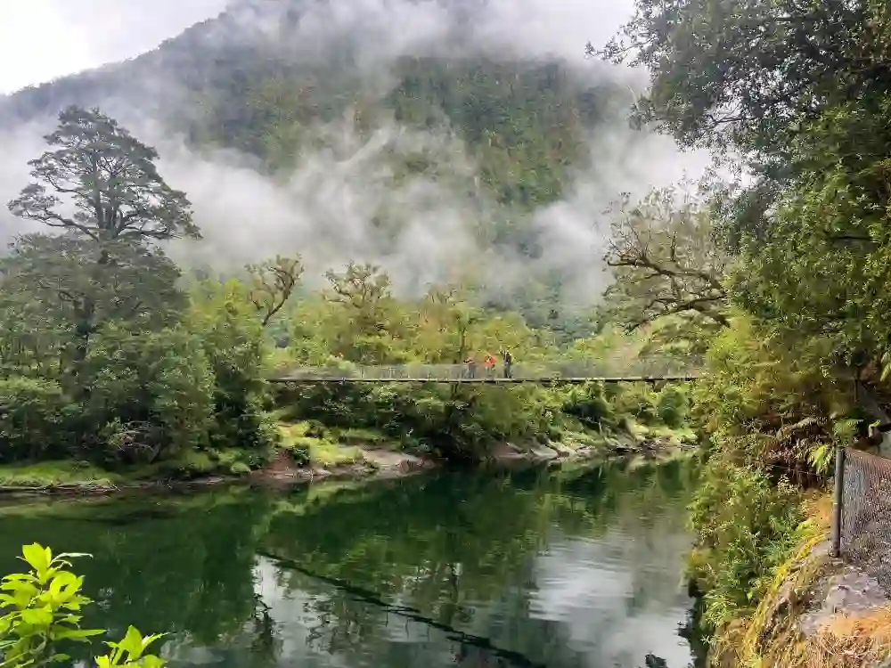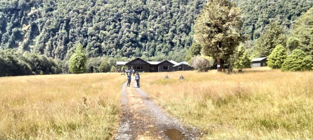 平坦ではあっても、やはり16kmはそれなりに疲れます。。。クリントン川旋回橋を渡り、ブナの原生林から背の高い草とマヌカの茂みが茂る広い広場を通過。