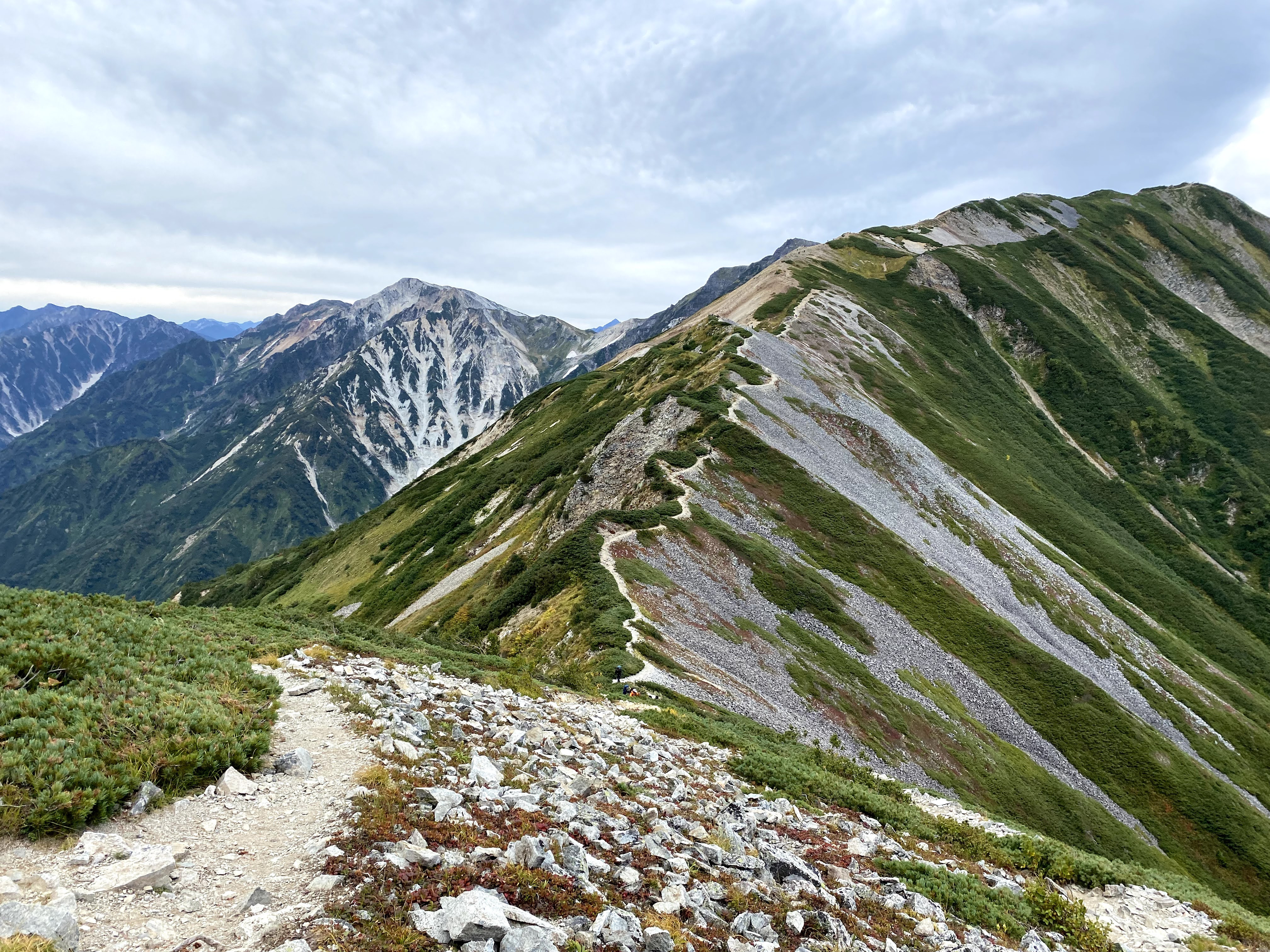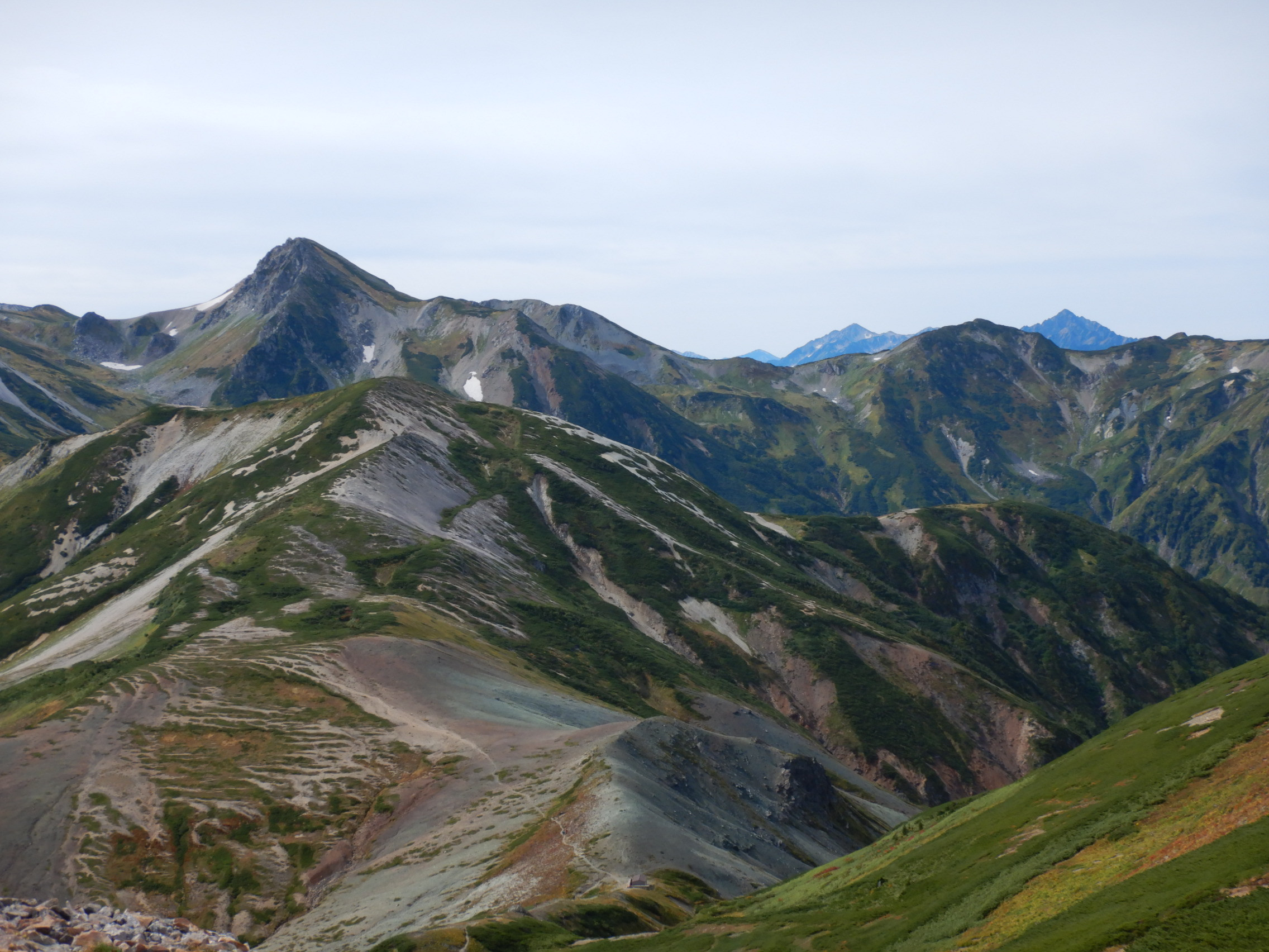 ここまで歩いてきたのかと言う稜線、そしてこれから歩く稜線と北アルプスの山々の絶景。