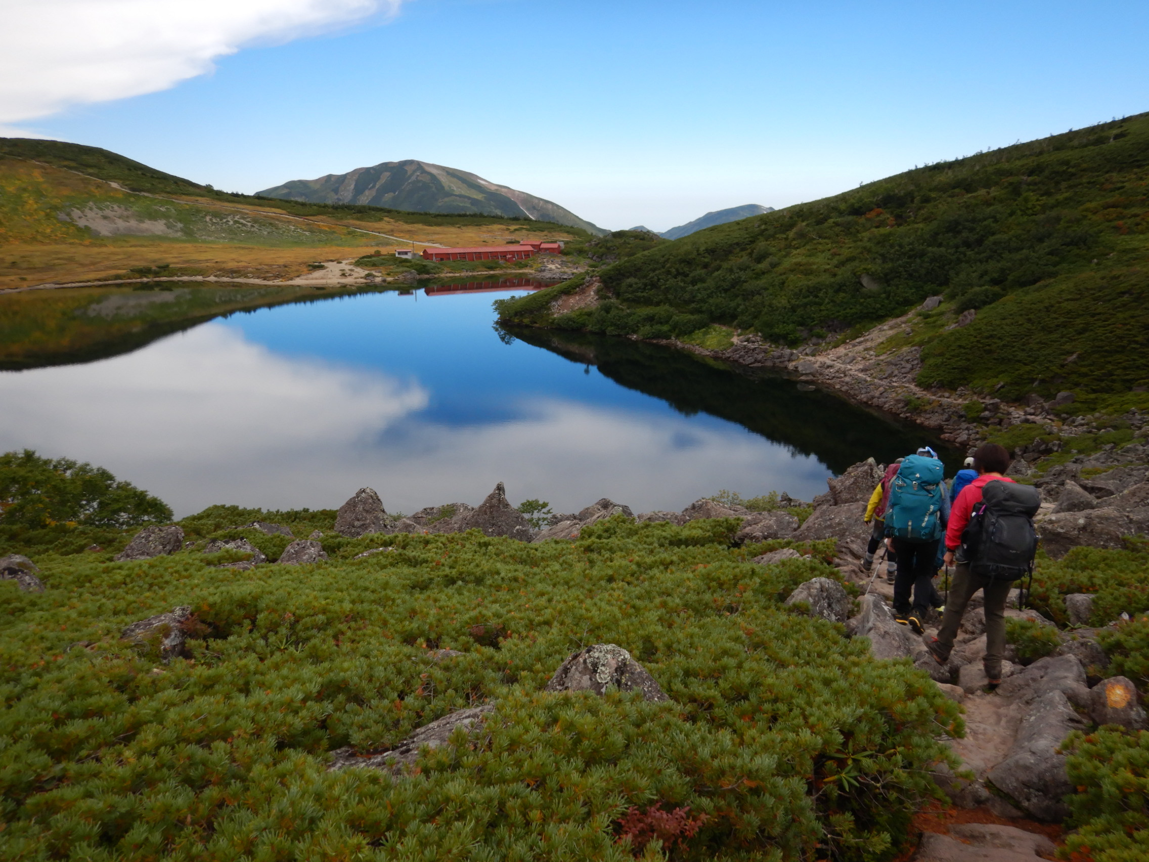 白馬大池で小休止。白馬三山のツアーではこちらの山小屋に宿泊します。