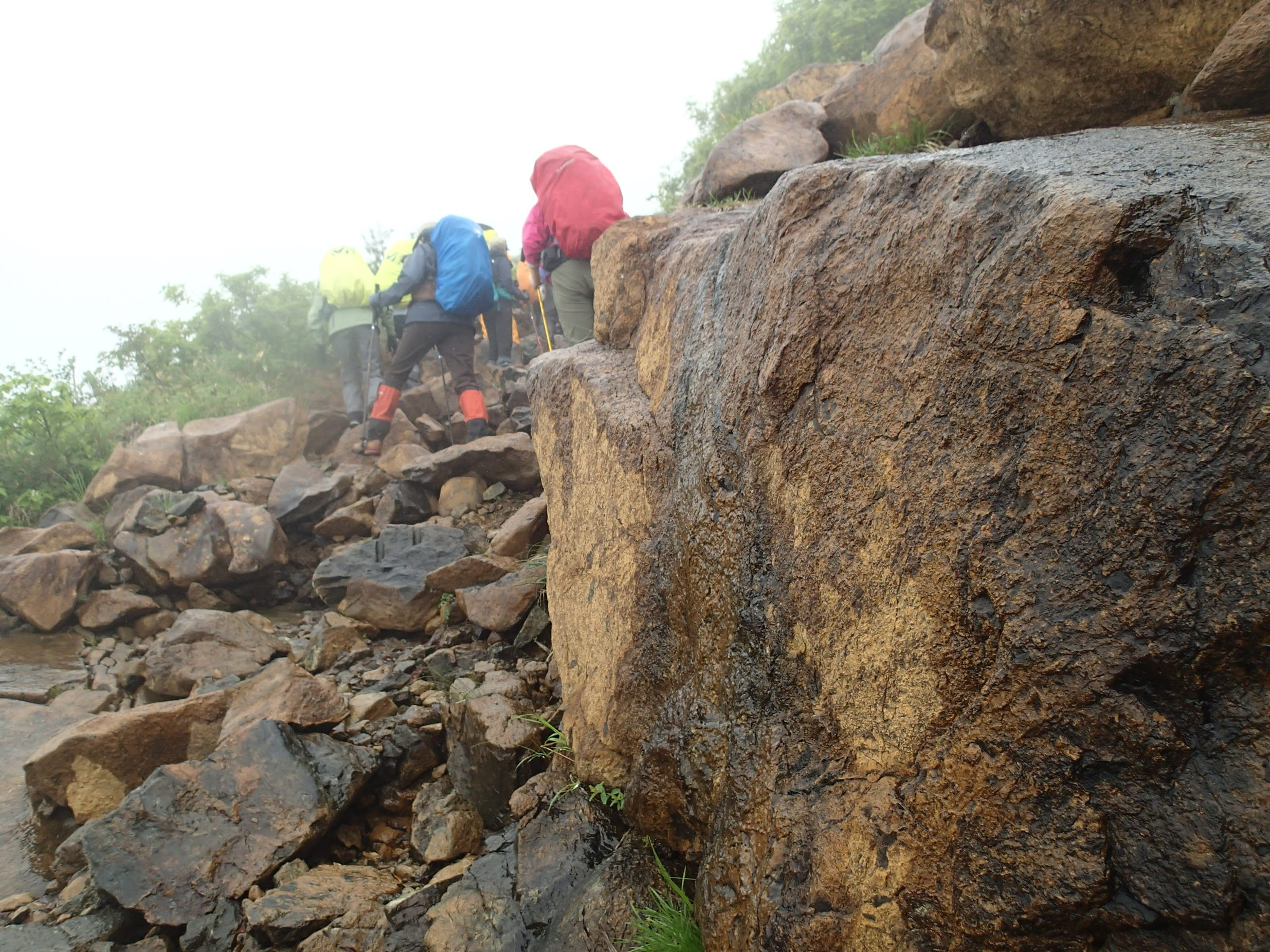 ツルツルで見るからに滑りそうな蛇紋岩が立ちはだかります。