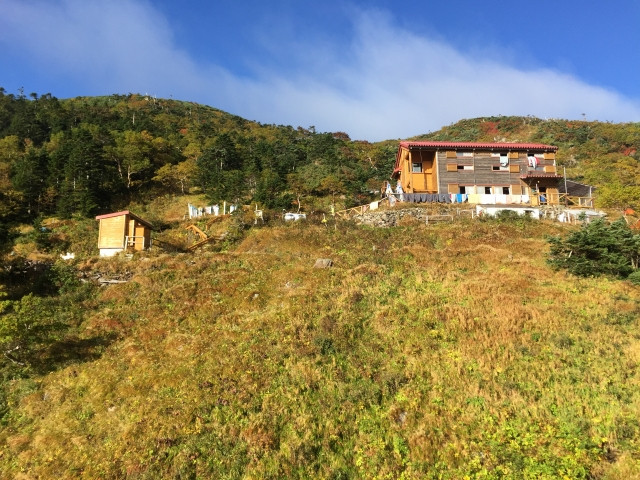 聖岳登山のベースとなるのは「聖平小屋」。聖沢上部の開けた場所にある山小屋で、ウェルカムフルーツポンチが有名でしたが、今年は、荷揚げの問題からフルーツポンチを含め、食事提供はしないそうです。残念…。写真は2018年9月のYamakaraツアーでの様子。