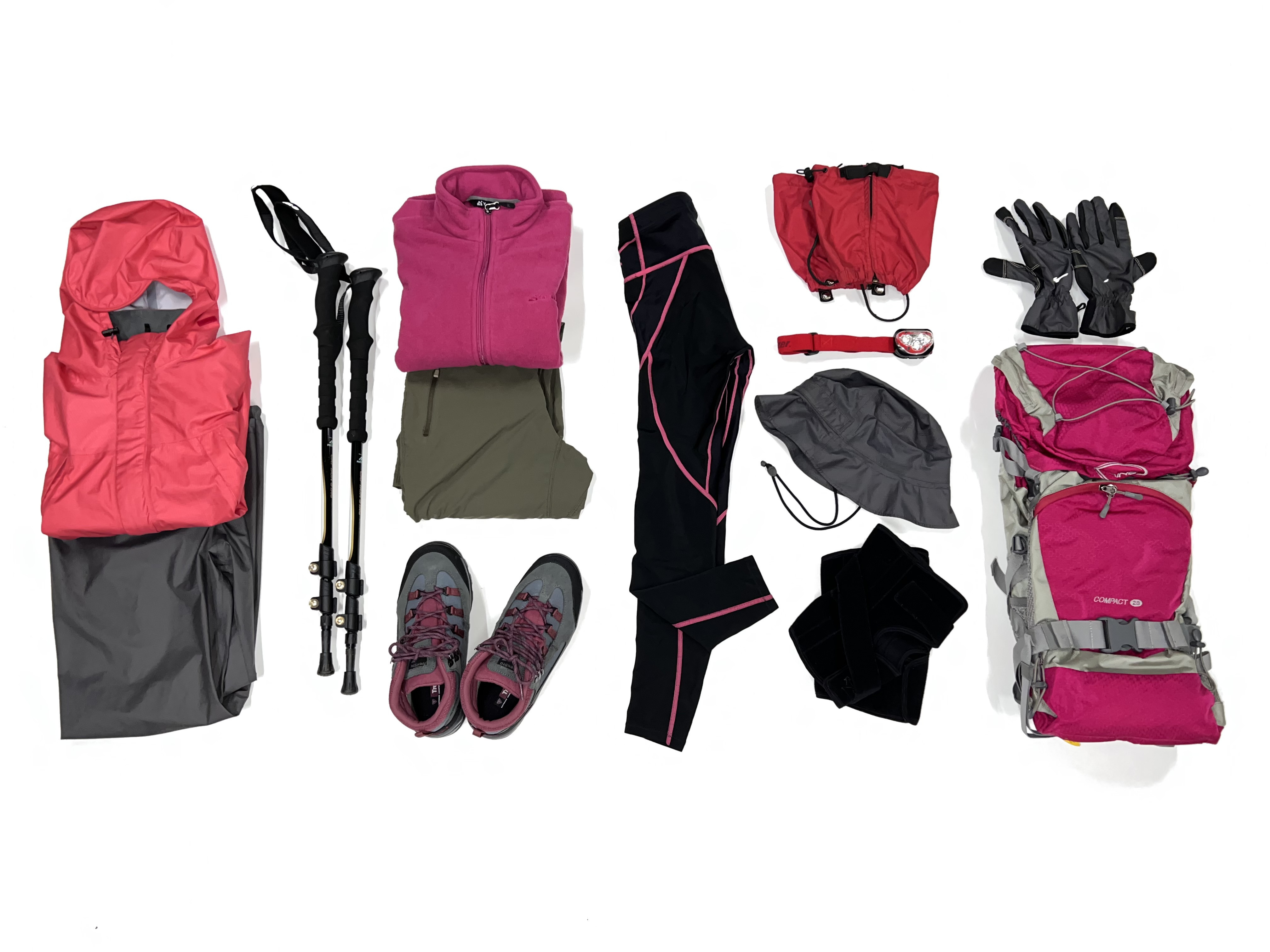 1.雨具上下、2.ストック、3.フリース(防寒着)、4.トレッキングパンツ、5.登山靴、6着圧タイツ、7.ショートスパッツ(泥除け)、