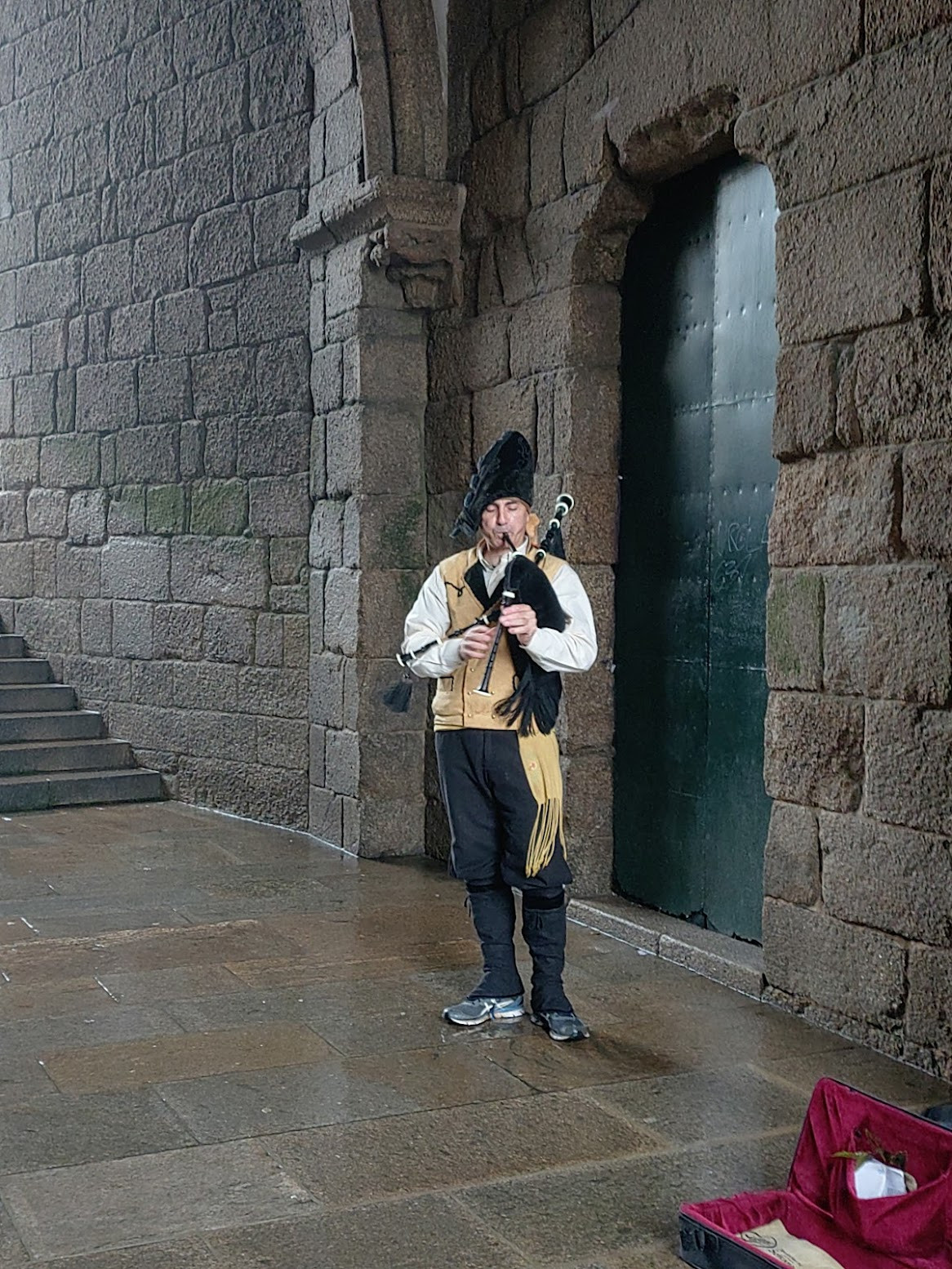 サンティアゴの大聖堂下で、昔ながらの衣装をまとった男性がバグパイプを吹いていた。