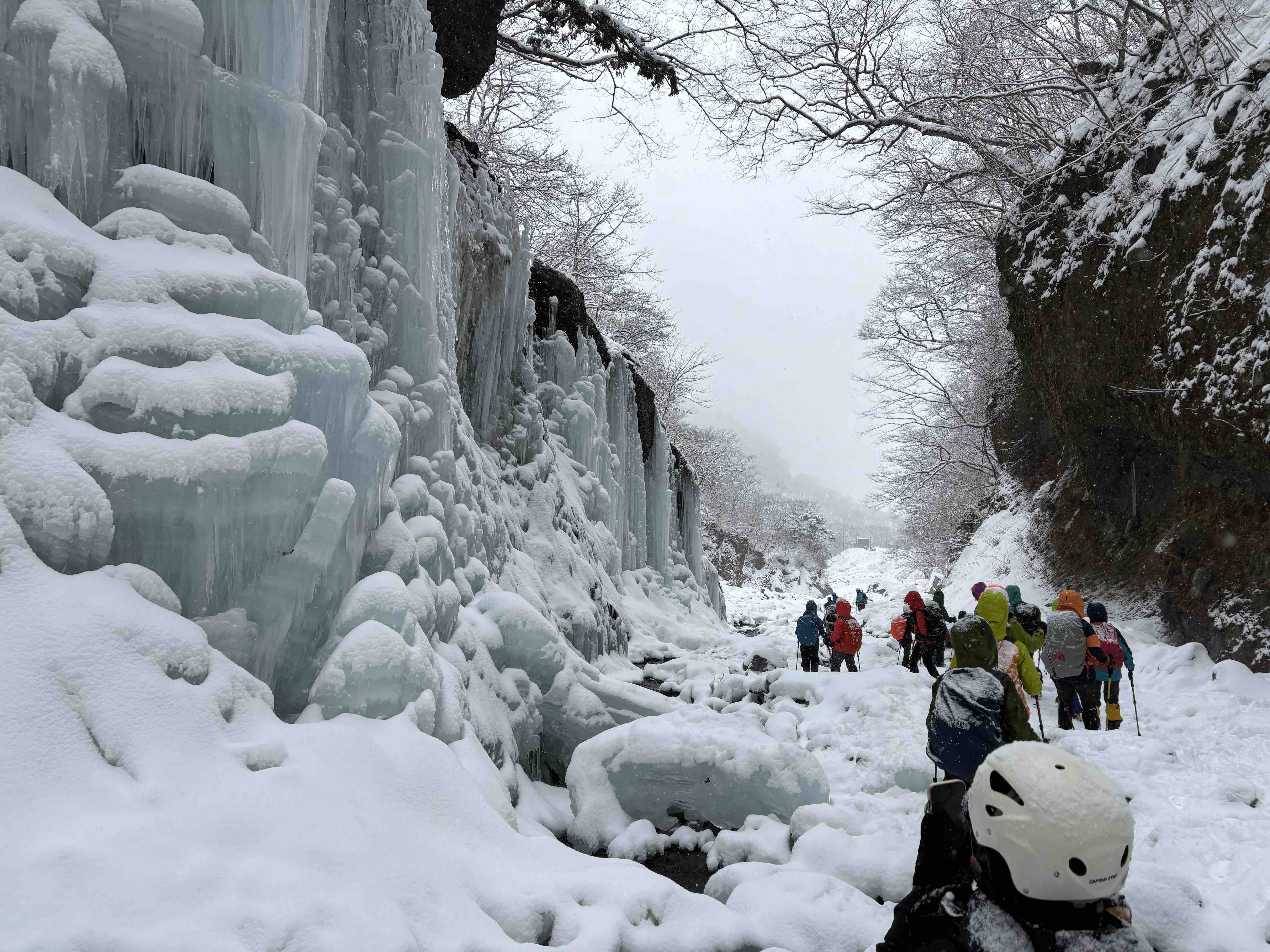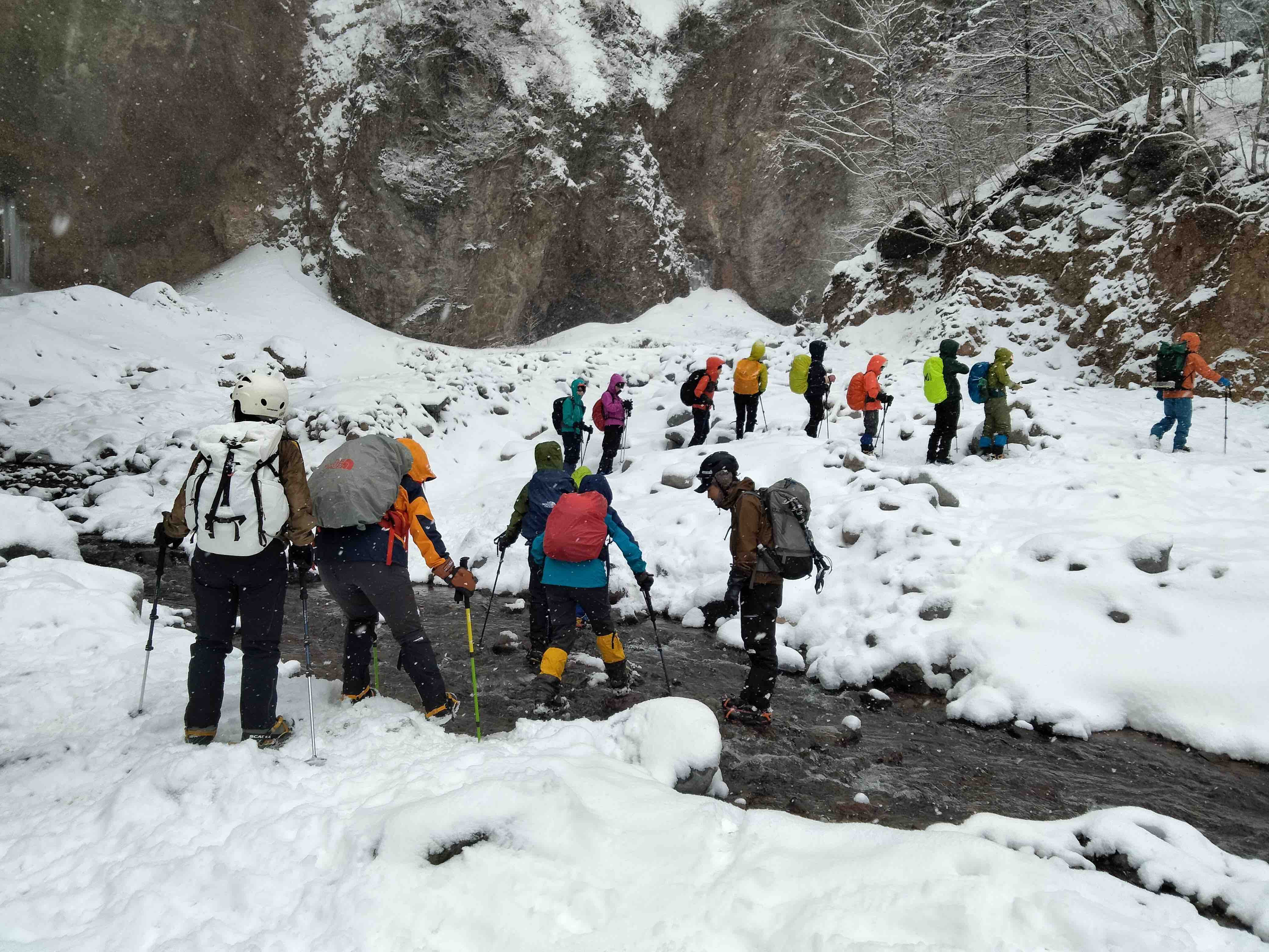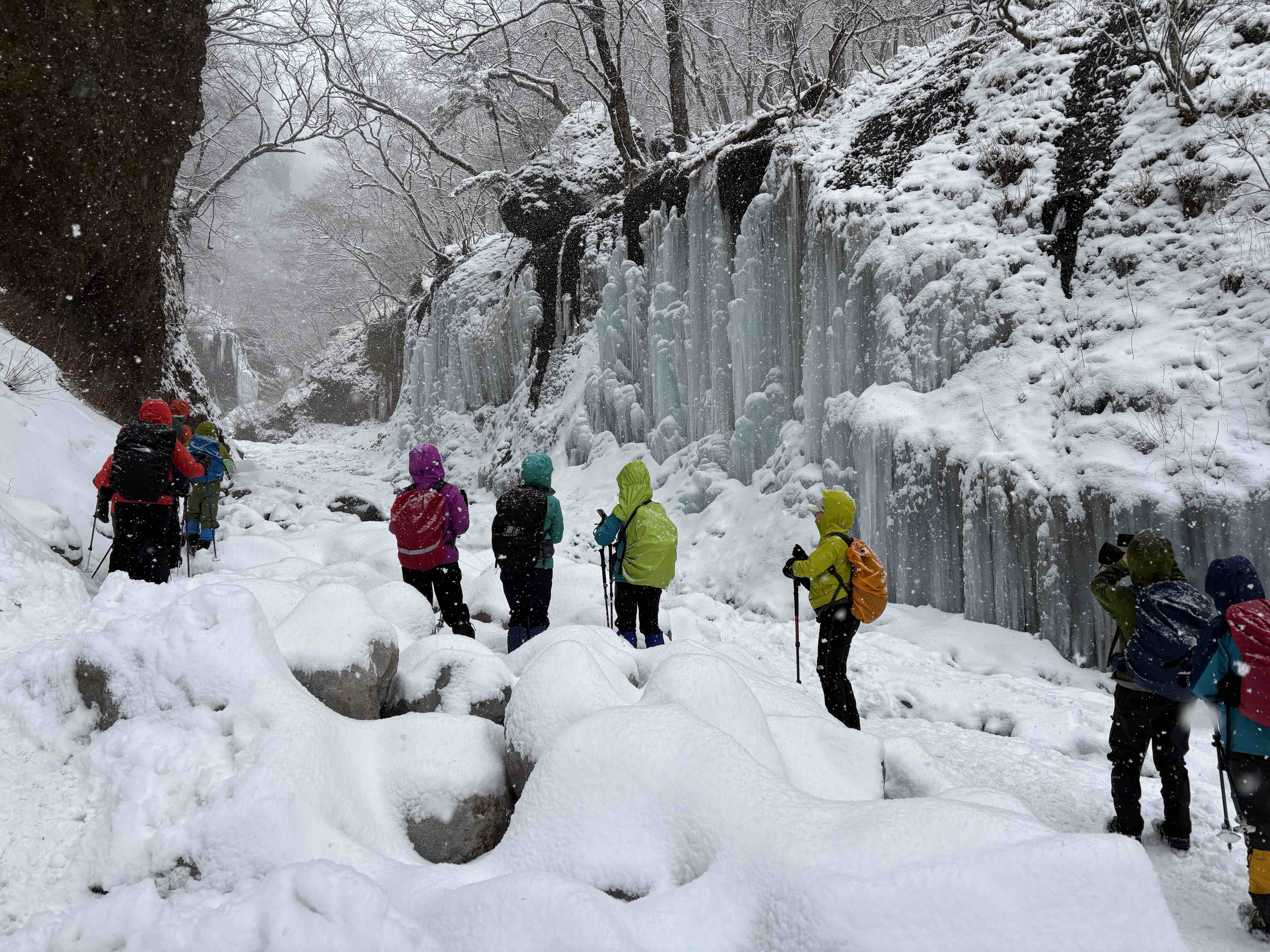 雪は降っていましたが、稜線ではないので風もほぼ吹かずに気分はおだやか。みなさんこの先に待ち受ける氷瀑に期待が膨らんでいるのか、寒さをもろともせず明るいおしゃべりに花が咲きます。