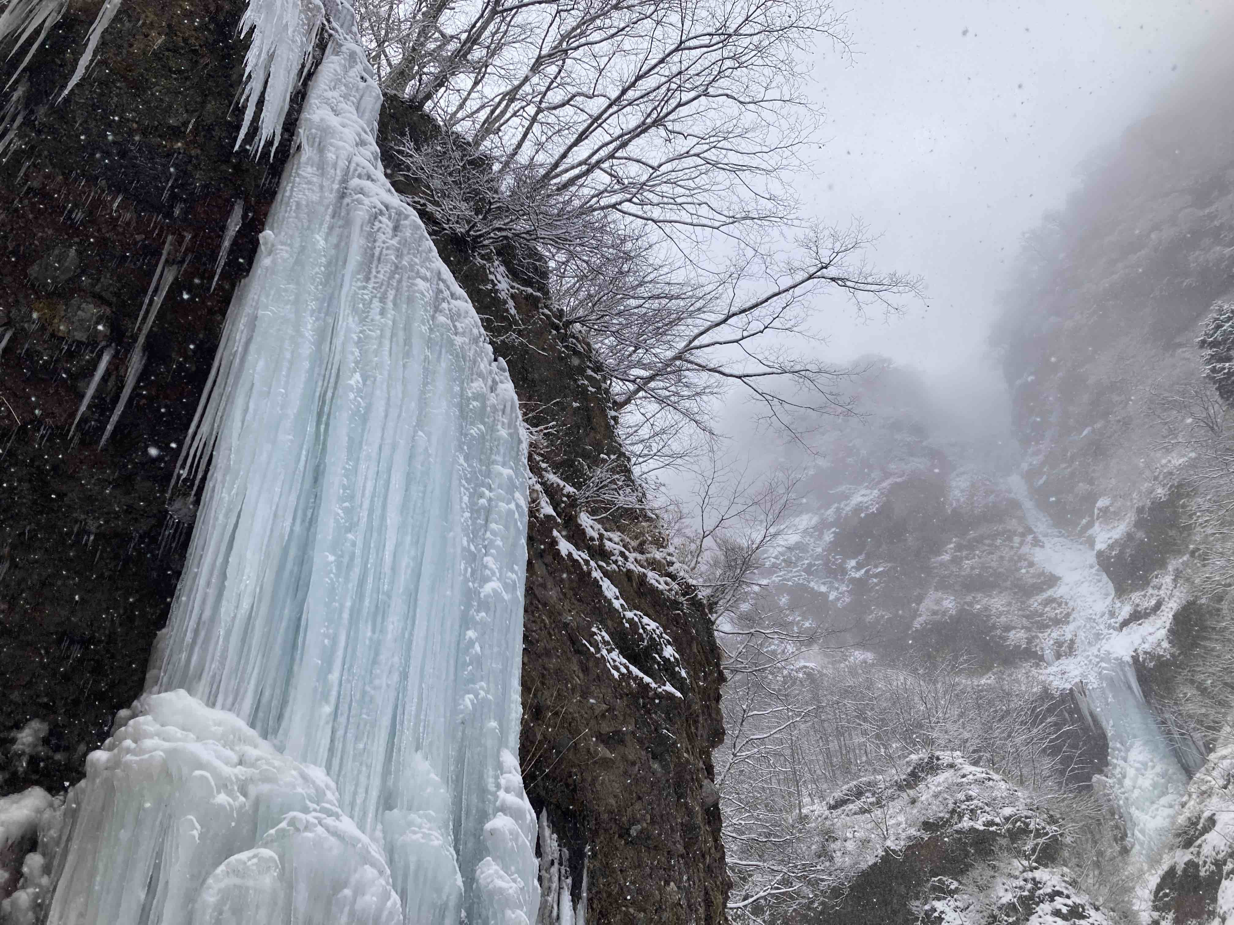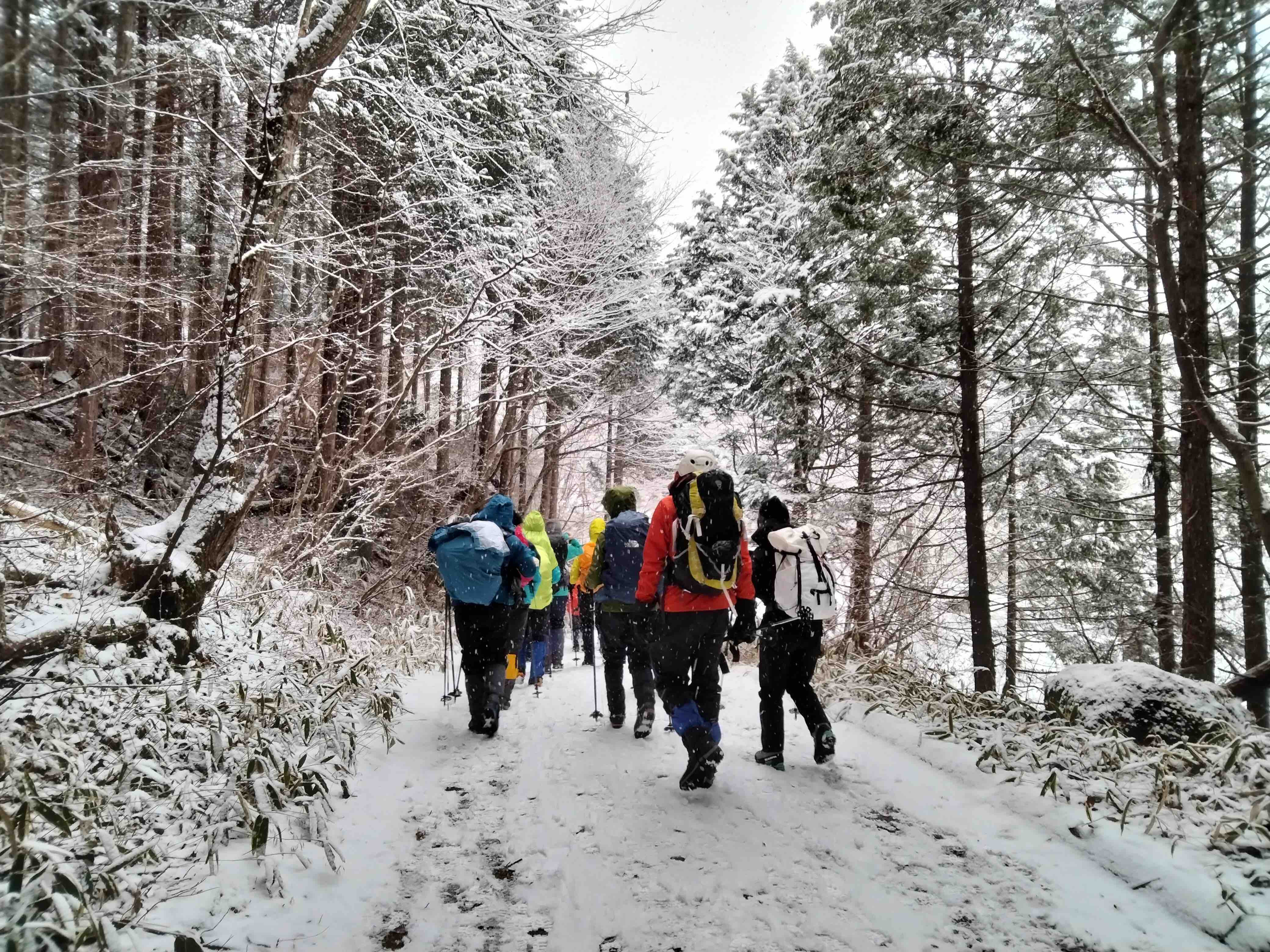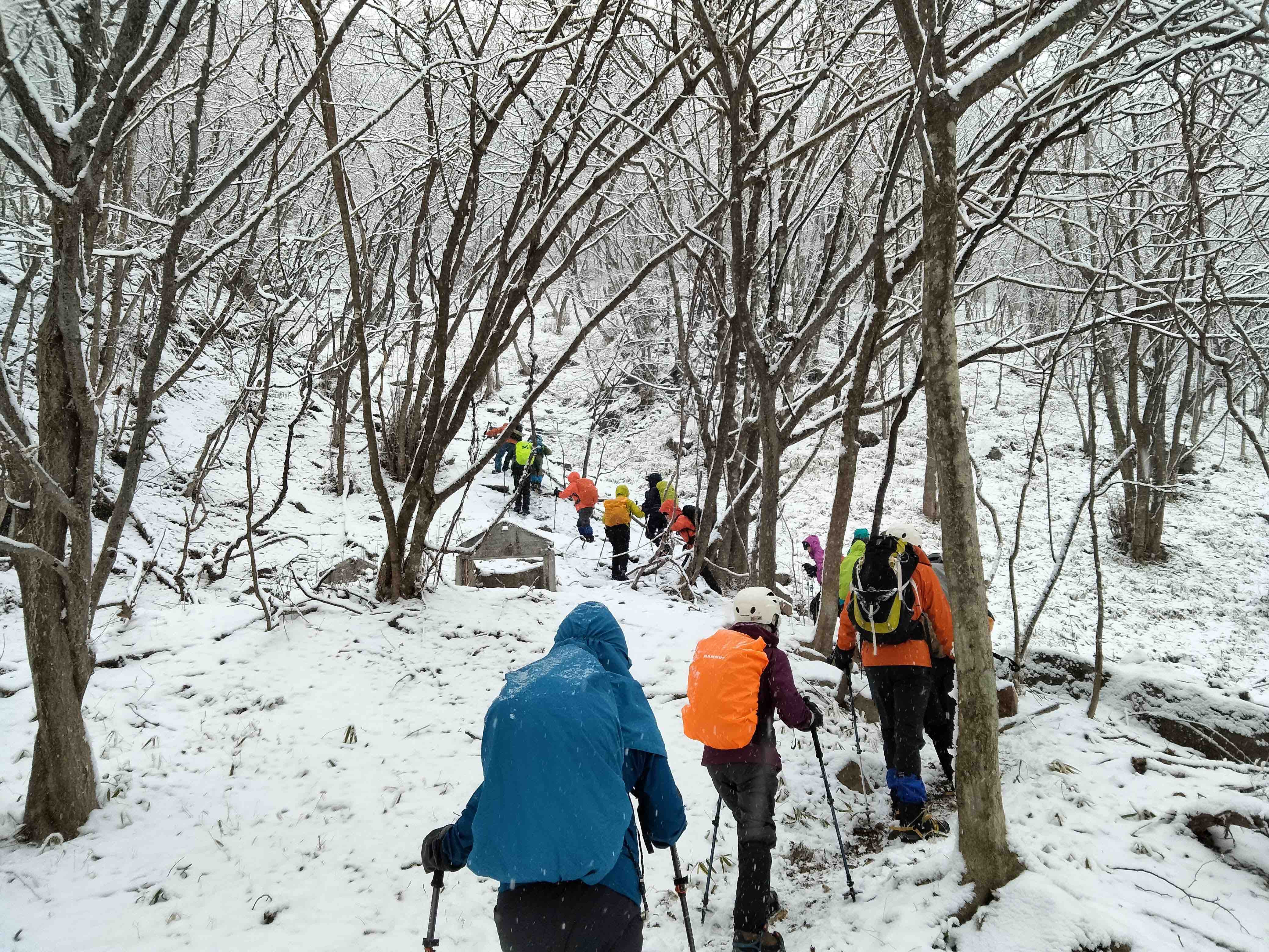雪は降っていましたが、稜線ではないので風もほぼ吹かずに気分はおだやか。みなさんこの先に待ち受ける氷瀑に期待が膨らんでいるのか、寒さをもろともせず明るいおしゃべりに花が咲きます。