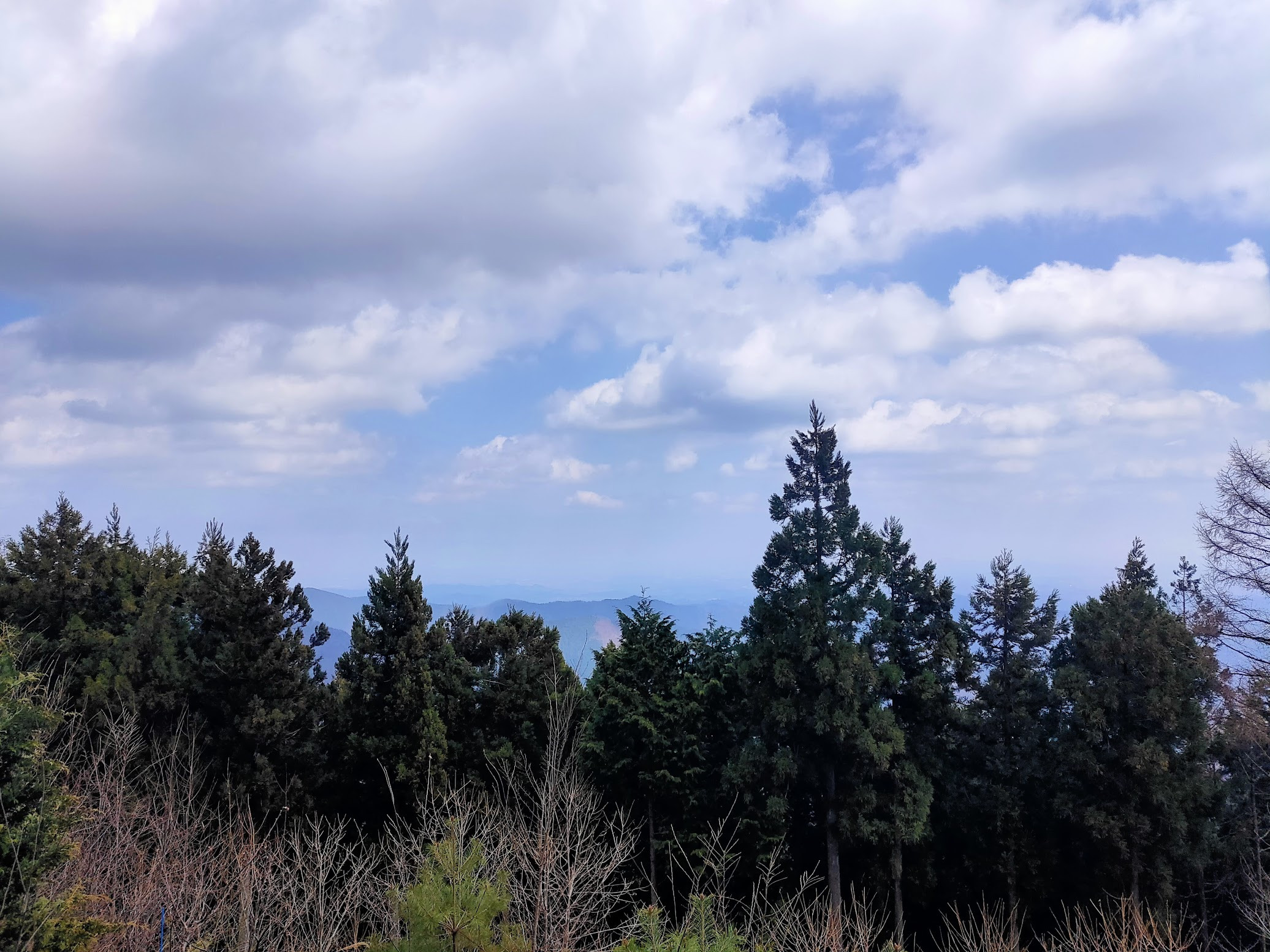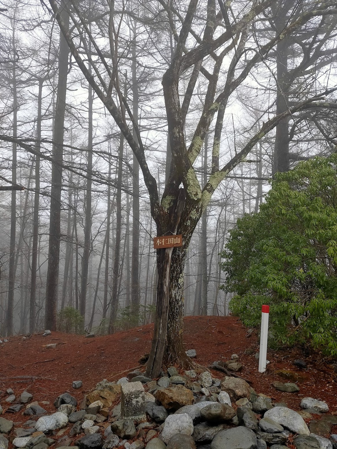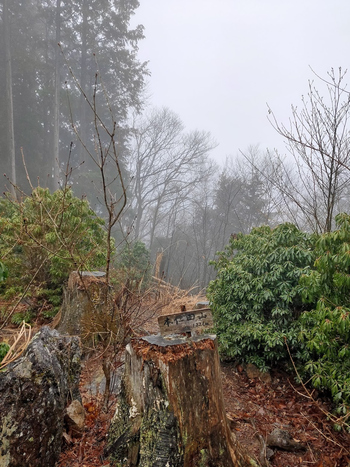 1時間ほど登り続けると、視界が開け、ついに山頂に到着です!残念ながら今日は雨模様。
