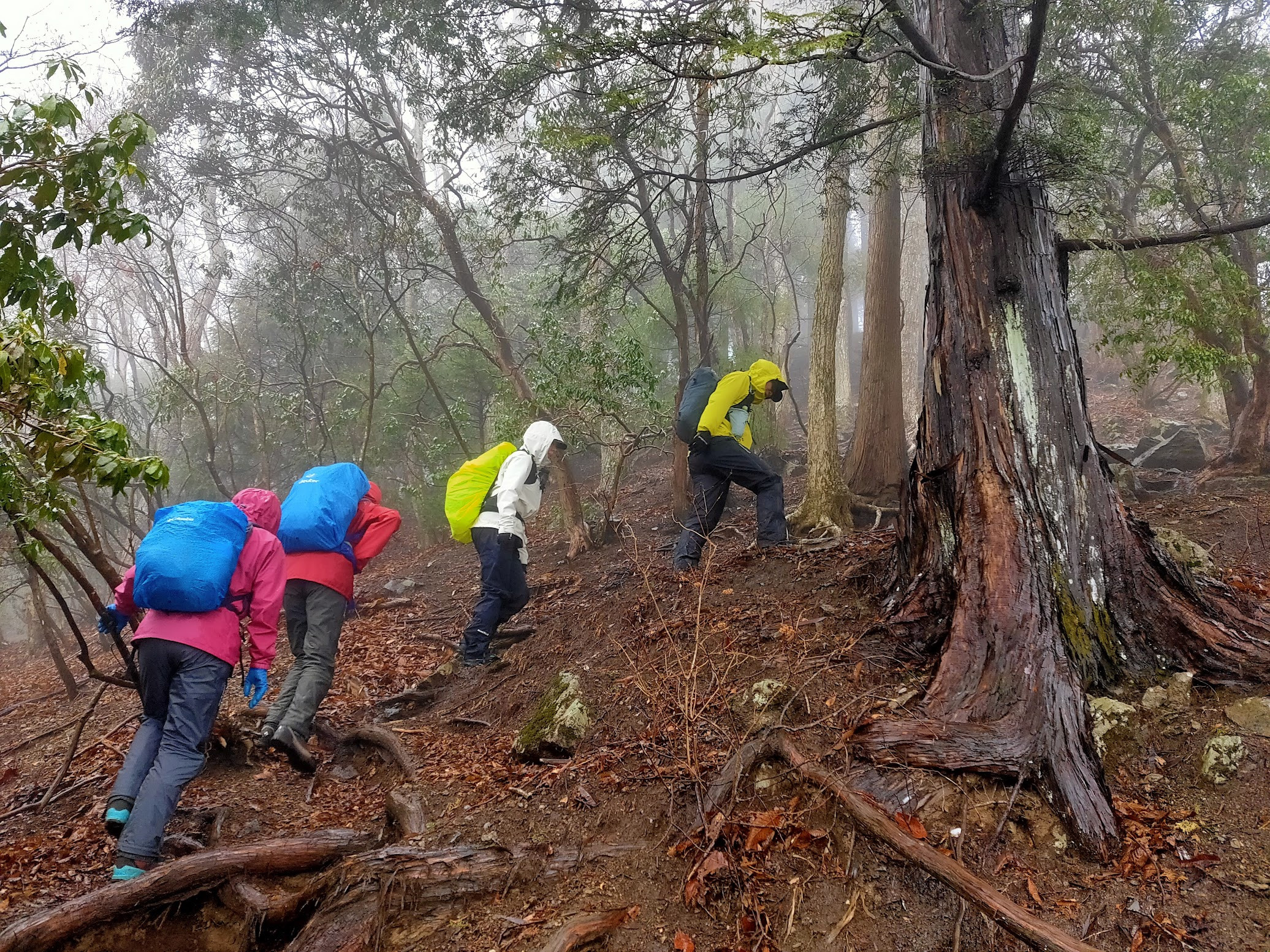 雨で足元が滑りやすいため、一歩一歩慎重に進みます。