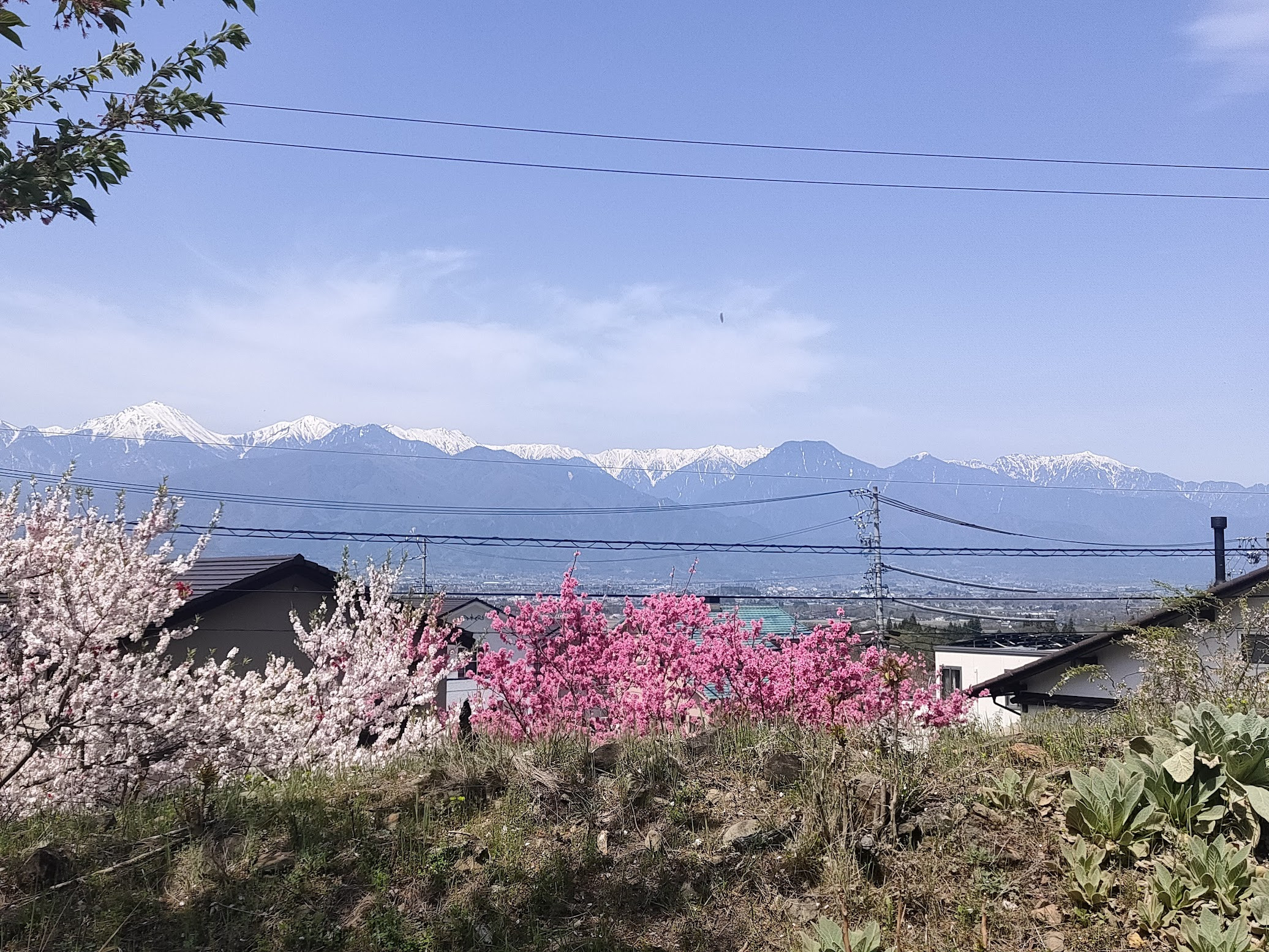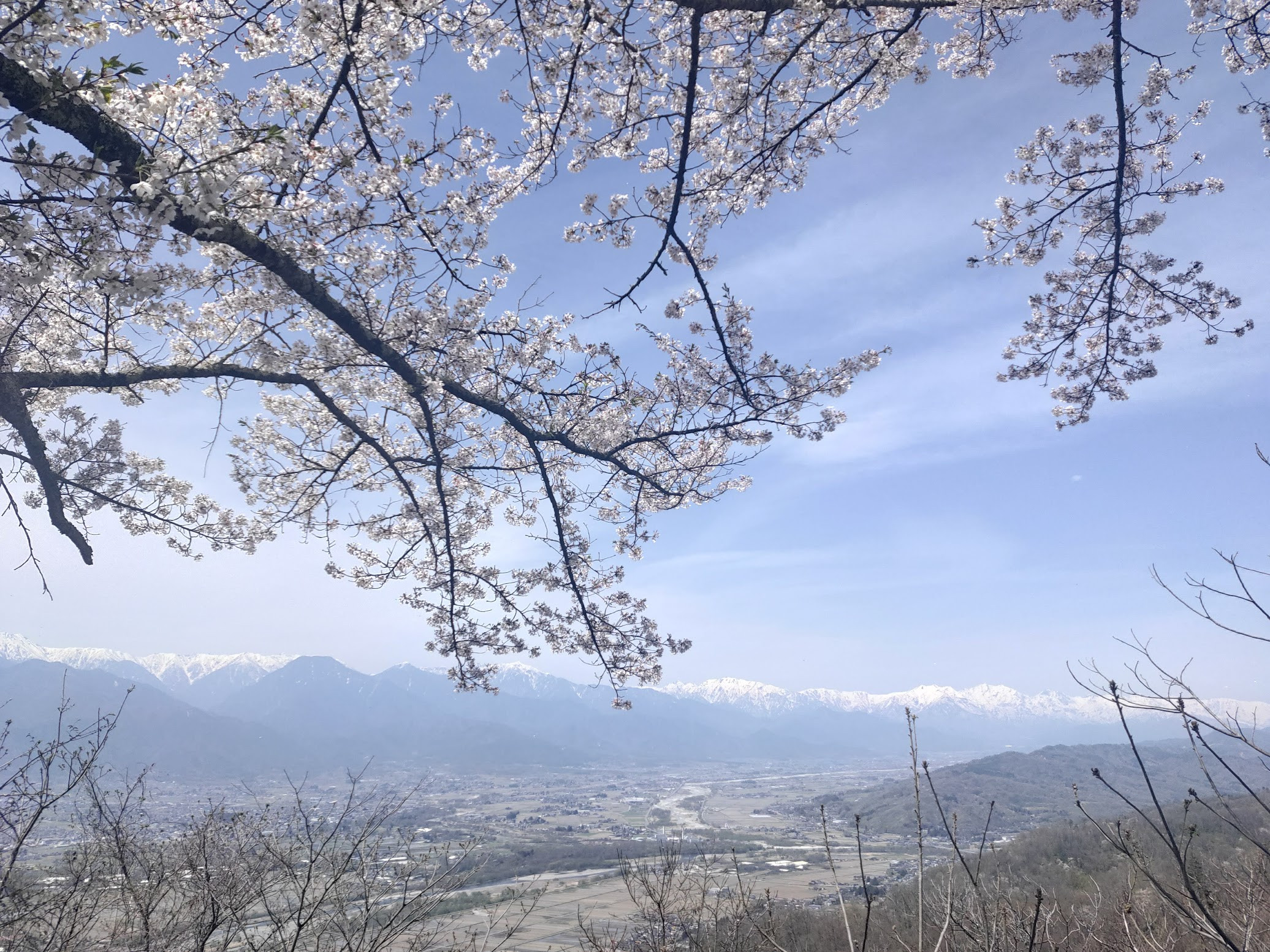 長峰山(ながみねやま)からは、安曇野の田園風景の向こうに雄大な北アルプスを一望でき、