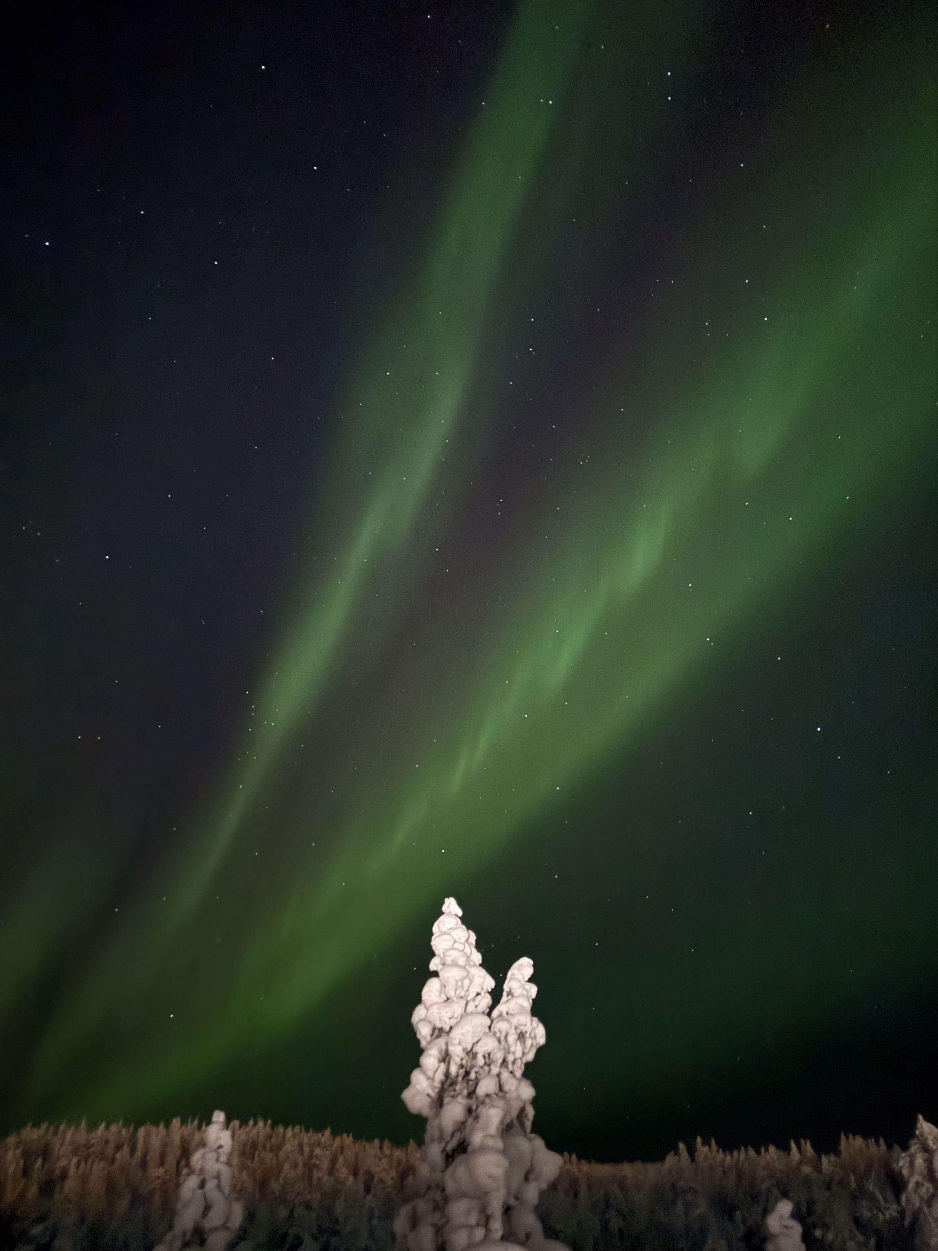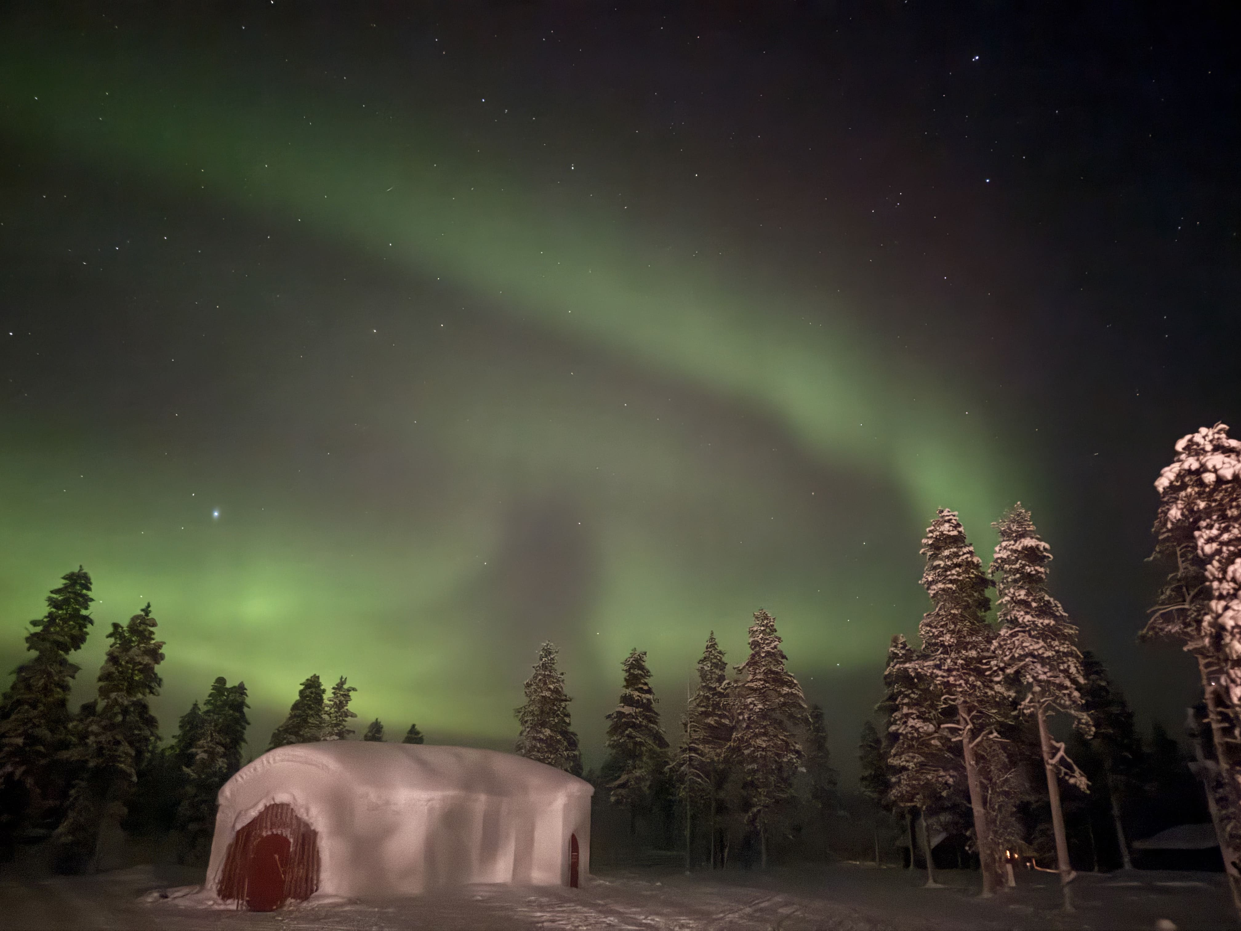 街の明かりから少し離れたウルホ・ケッコネン国立公園の中にあるオーロラハウスで鑑賞できます。私にとってここは、人生初のオーロラを見ることができた思い出のスポットです。
